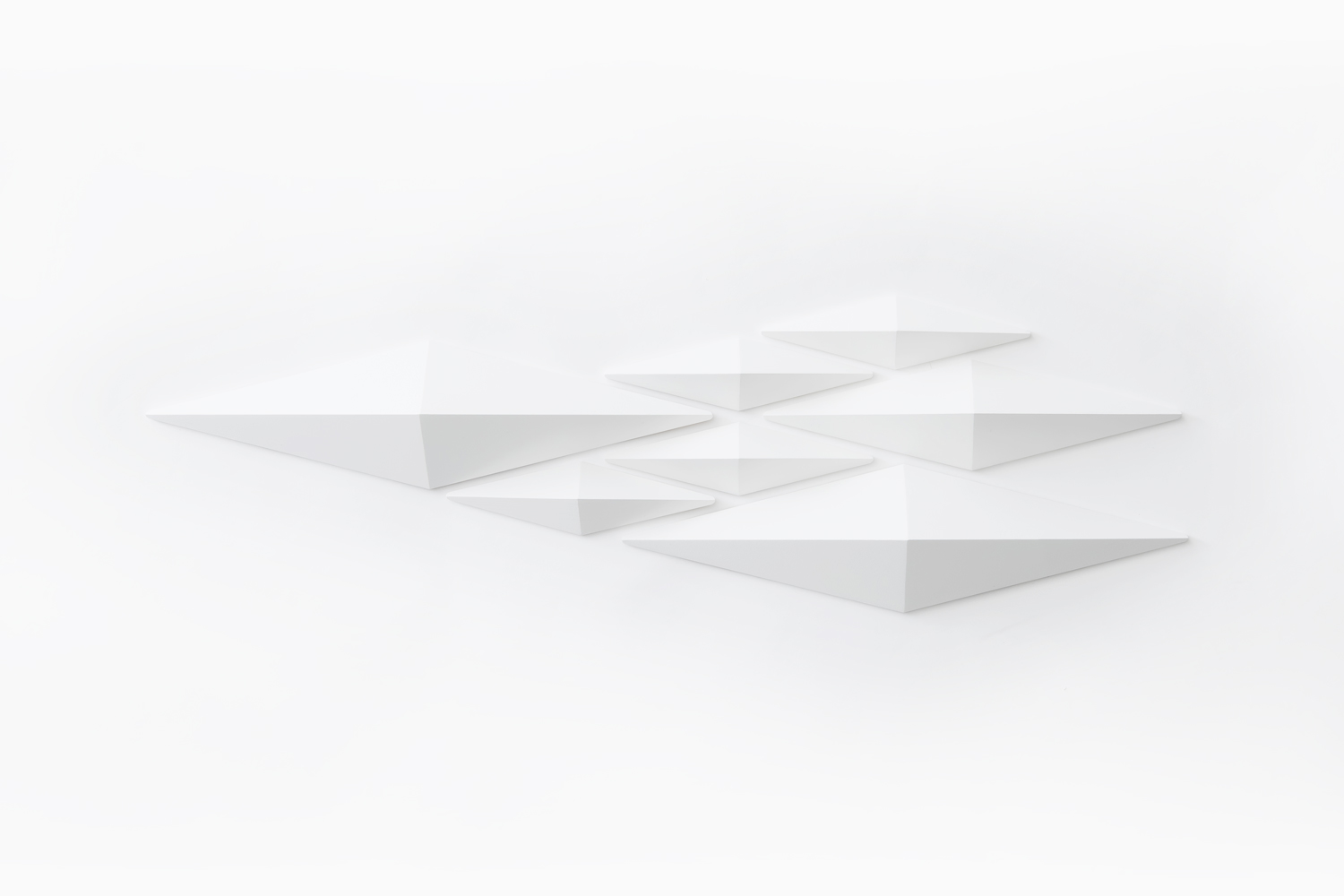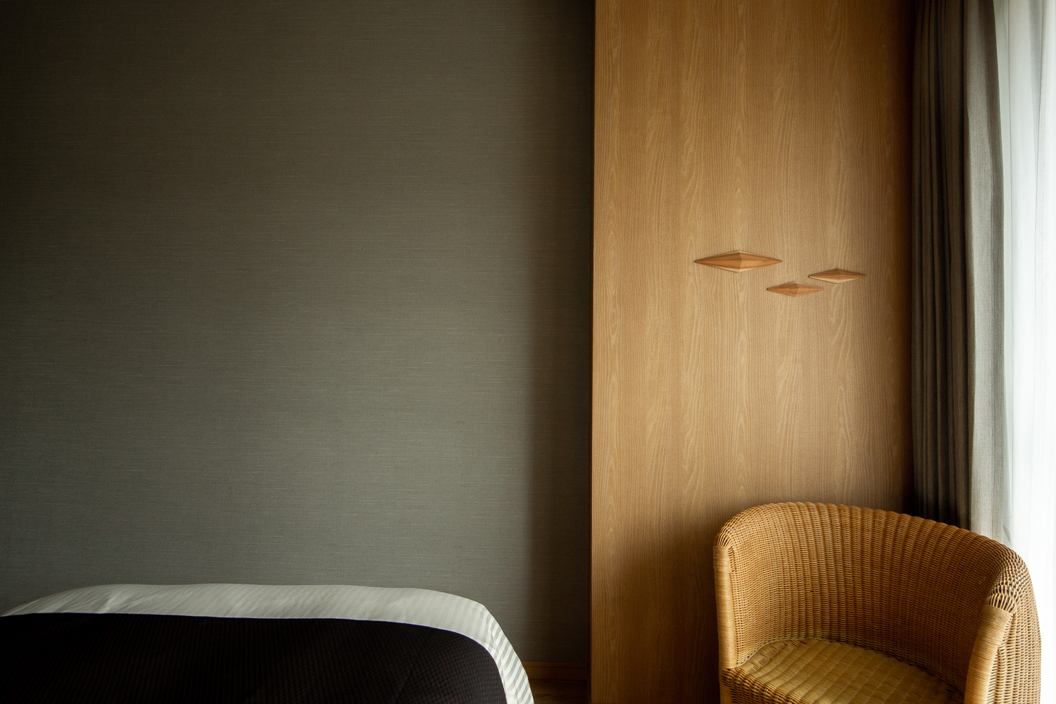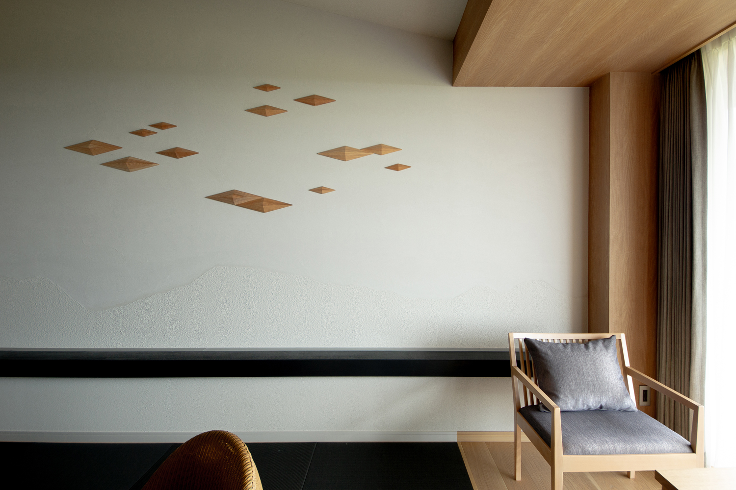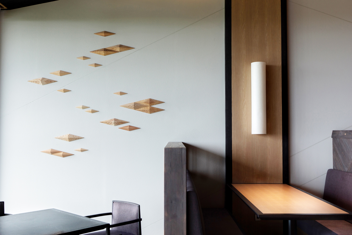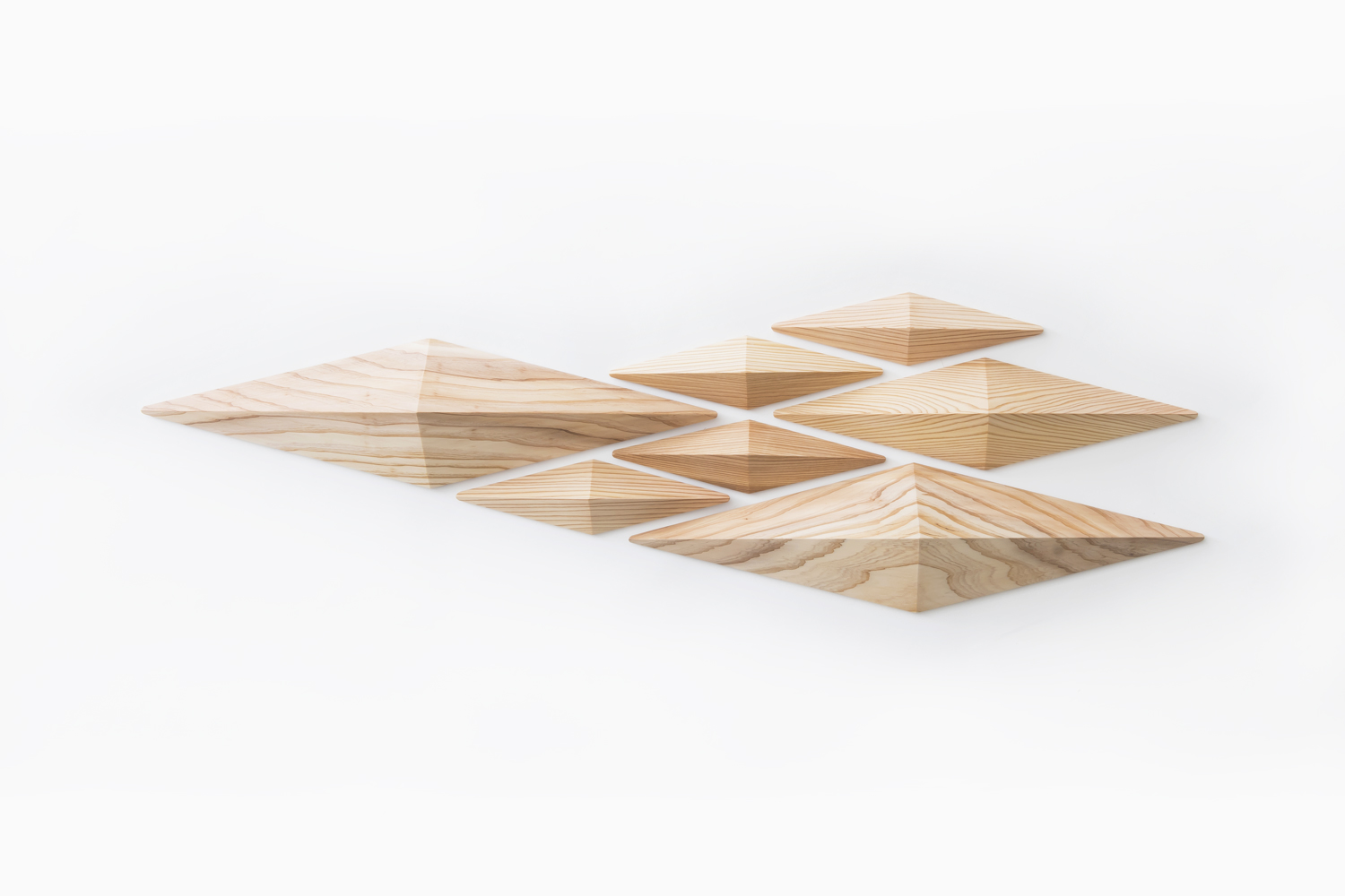 杉の比重の軽さを生かしたウォールアドーンメント。南小国の環境を想起させる様に、山並みを表現できるランドスケープを模したプロダクト。日照時間によって移り変わる陰影が表情かえて、内の環境と外の環境を共鳴させるプロダクトとなっている。