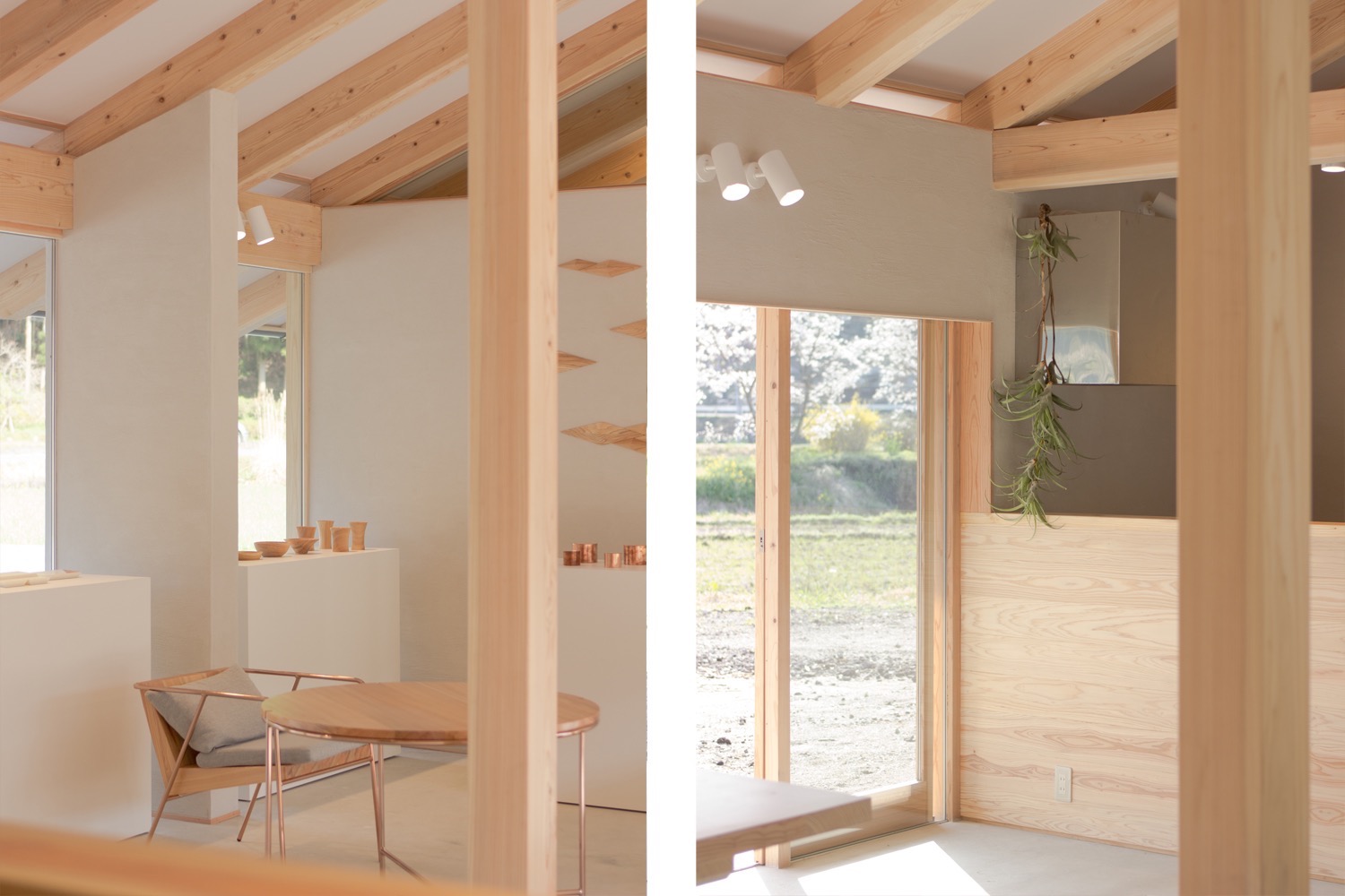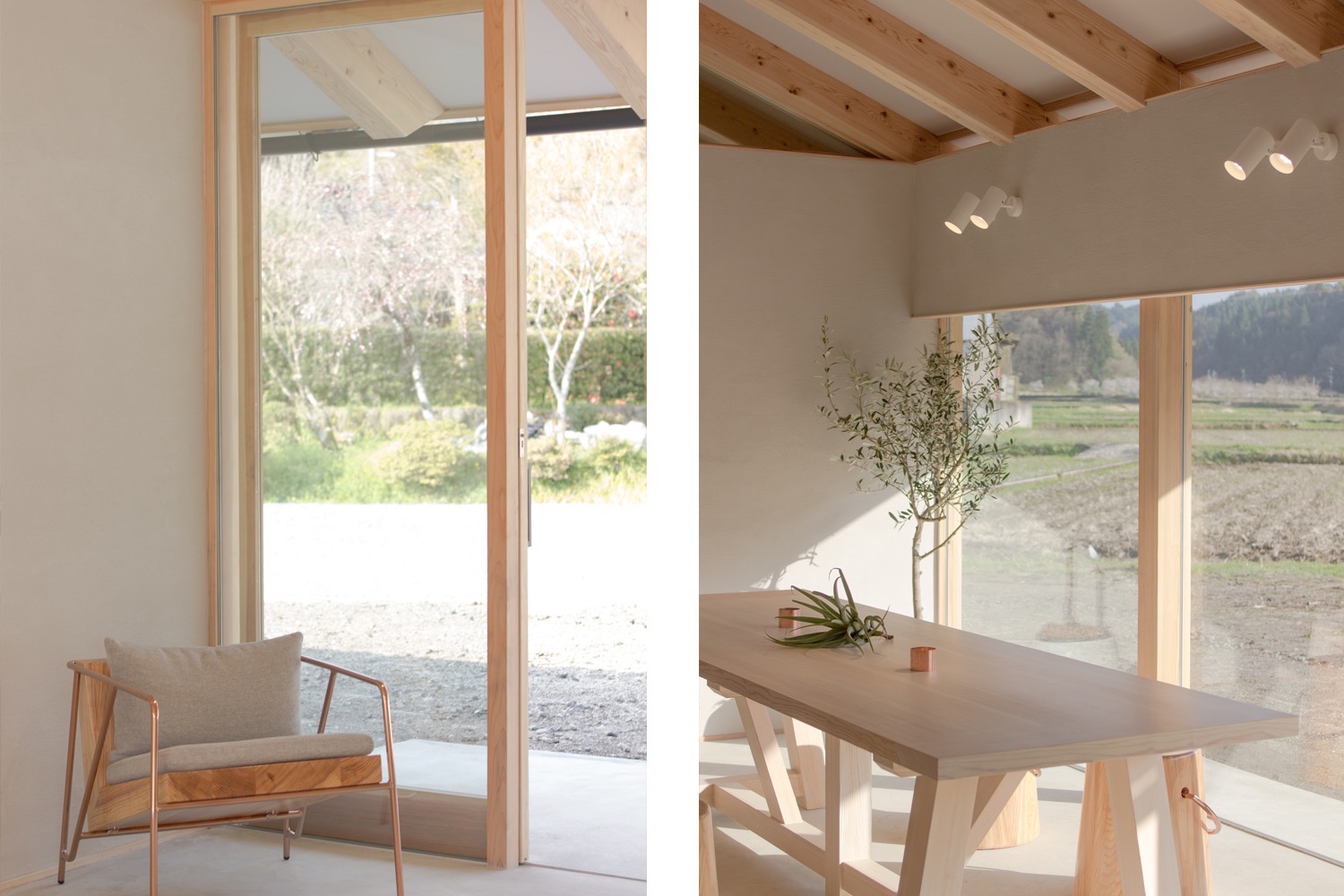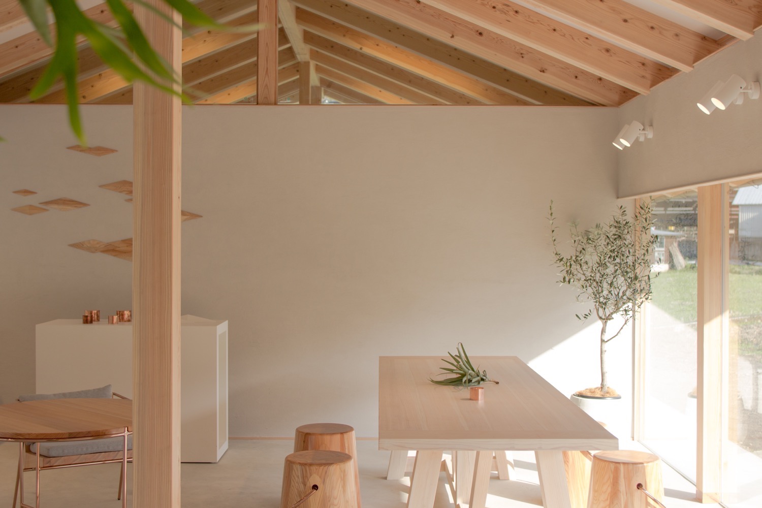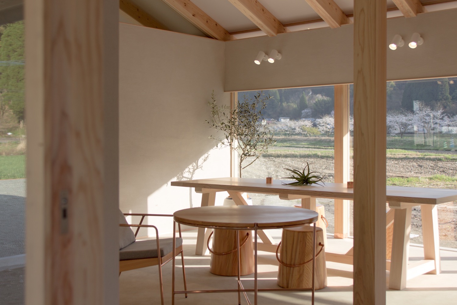 店舗部分の空間は周辺の景観を引き込む設計で、地場産の木材である小国杉を生かした空間構成になっている。赤みのある杉材を引き立たせるため、相性の良い銅色でフレームを構成したFILブランドの家具が、素材の対比によって木材の生命力を引き立たせる空間構成となっている。
