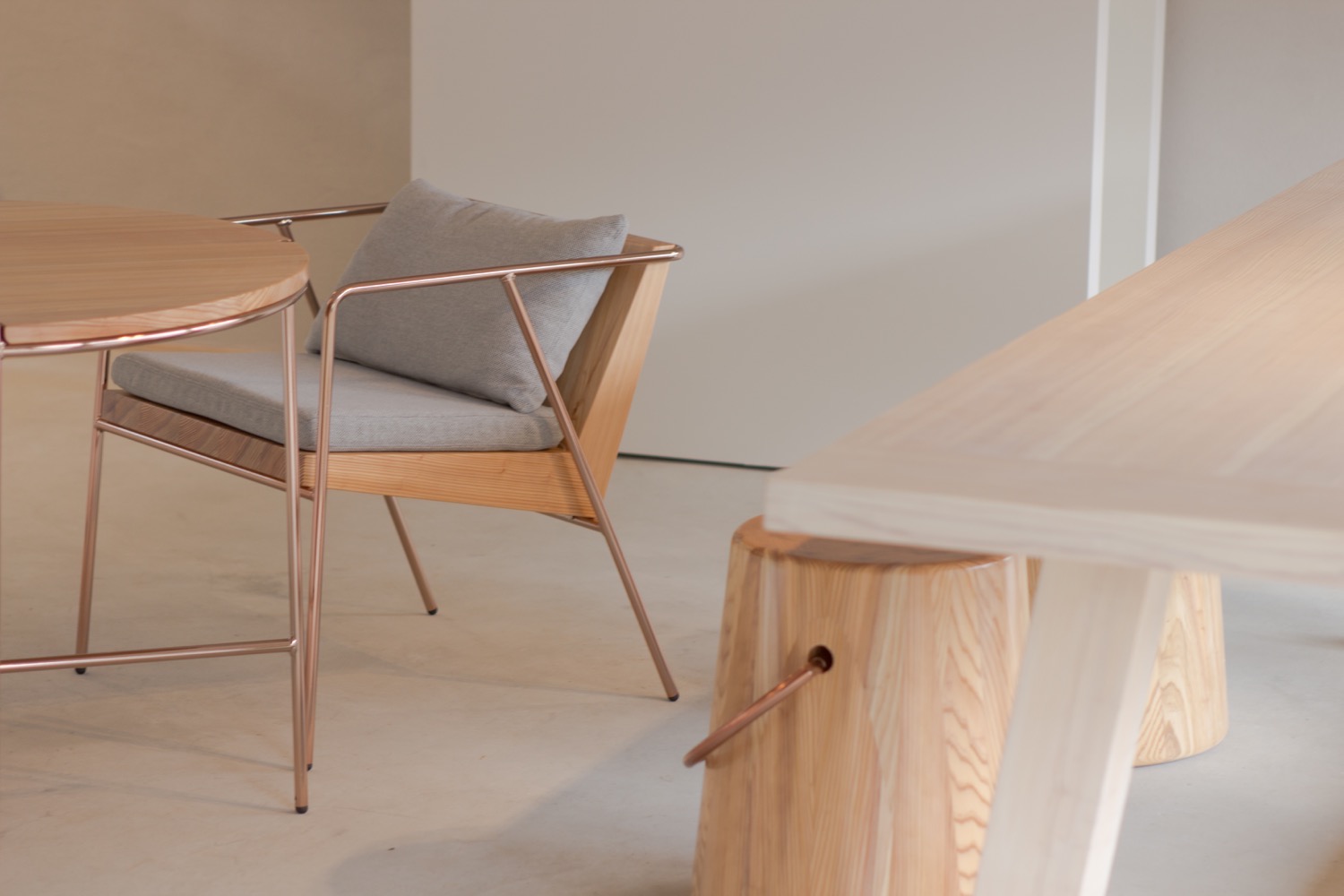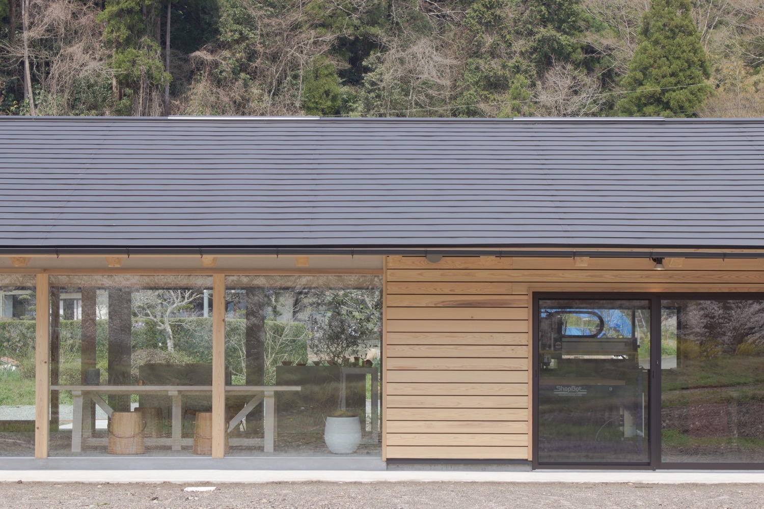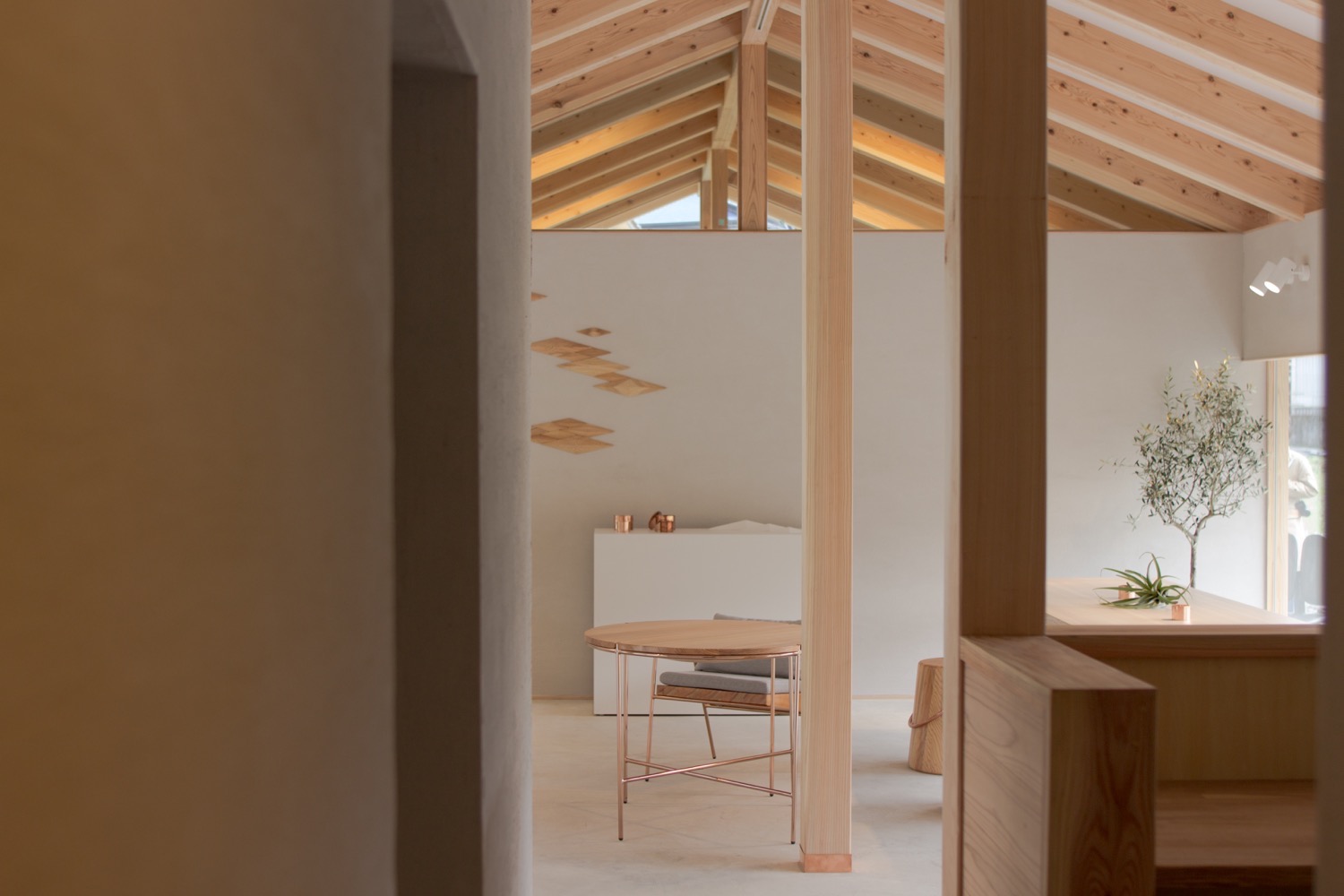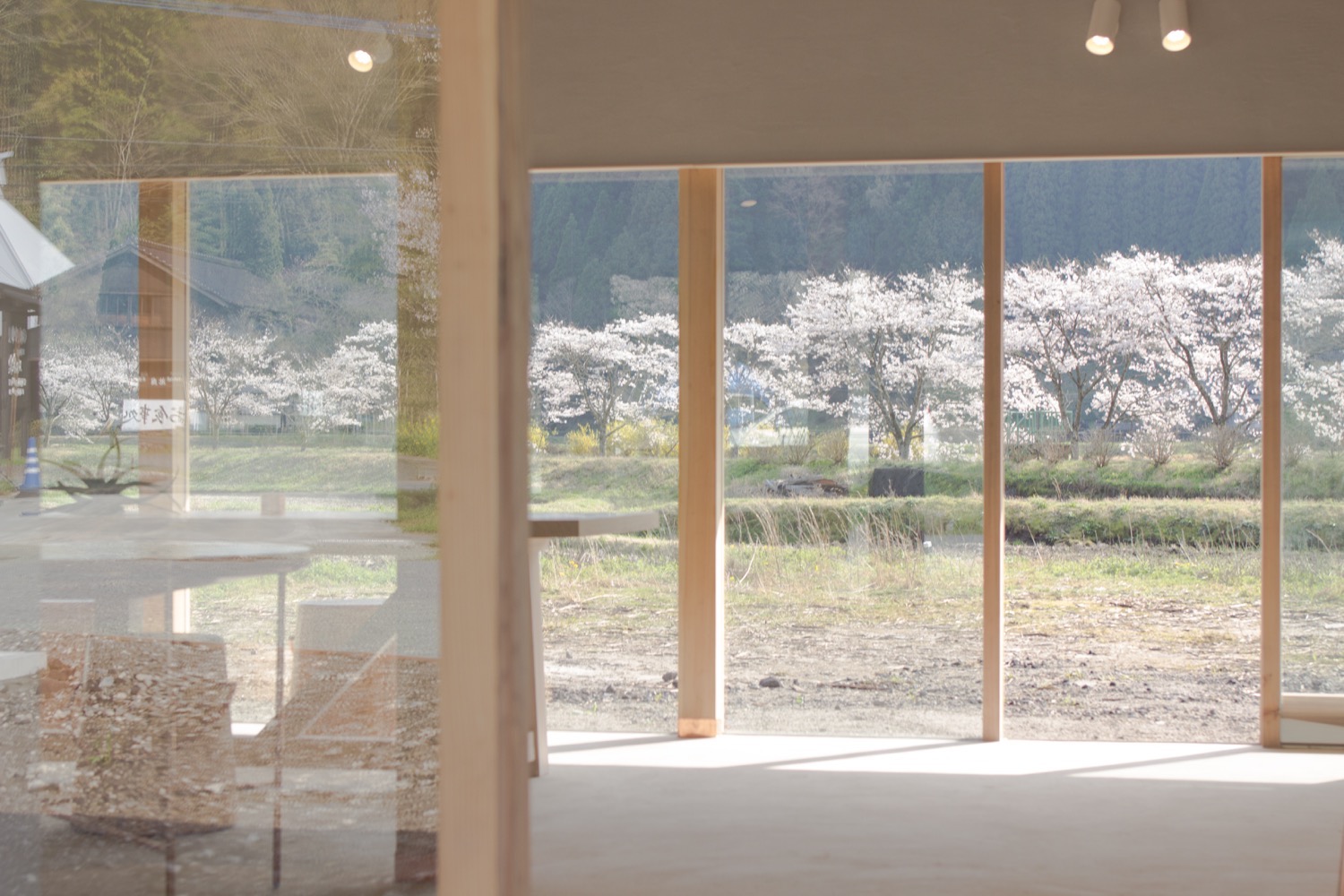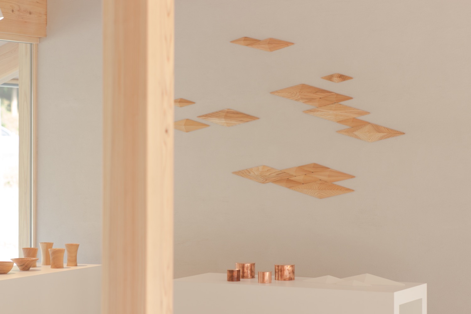 店舗部分の空間は周辺の景観を引き込む設計で、地場産の木材である小国杉を生かした空間構成になっている。赤みのある杉材を引き立たせるため、相性の良い銅色でフレームを構成したFILブランドの家具が、素材の対比によって木材の生命力を引き立たせる空間構成となっている。