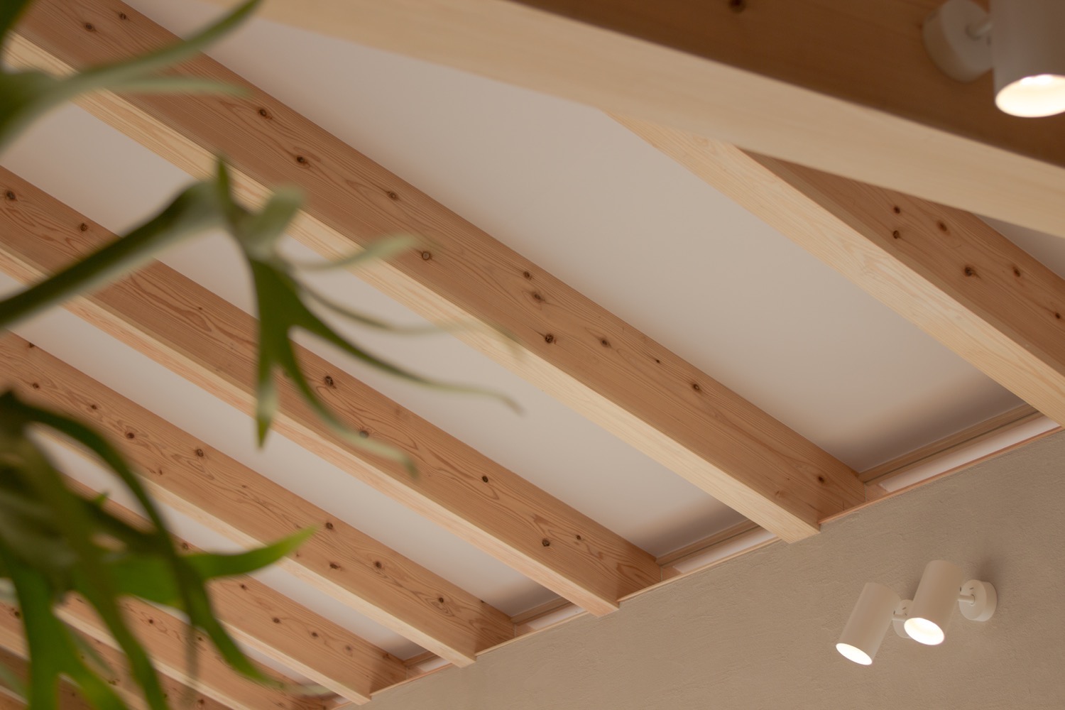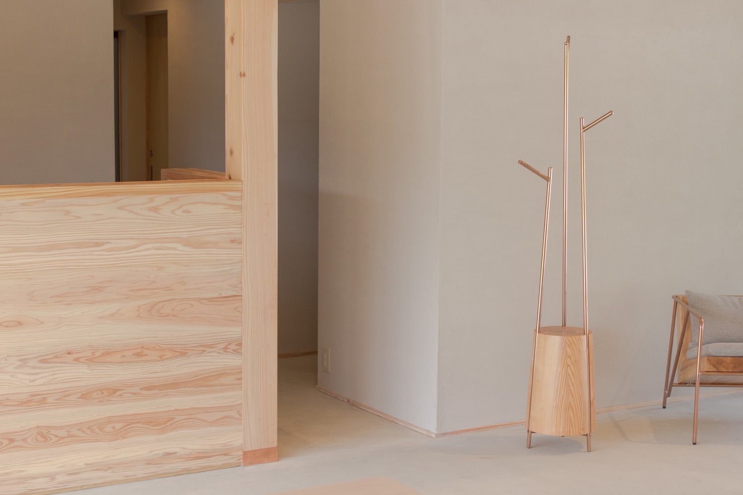 The store part of the space is designed to draw in the surrounding landscape, and makes use of the local Oguni cedar. In order to bring out the redness of the cedar, FIL brand furniture constructed with a complimentary copper color frame is contrasted with it, and this creates a space which brings out the vitality of the cedar.