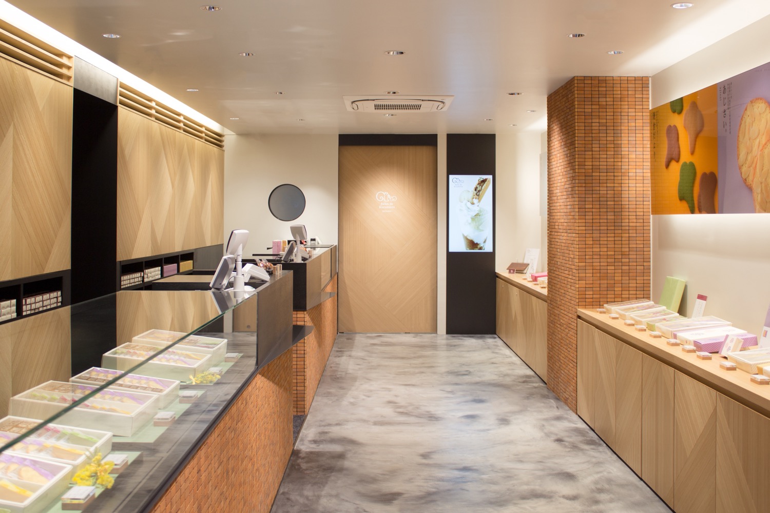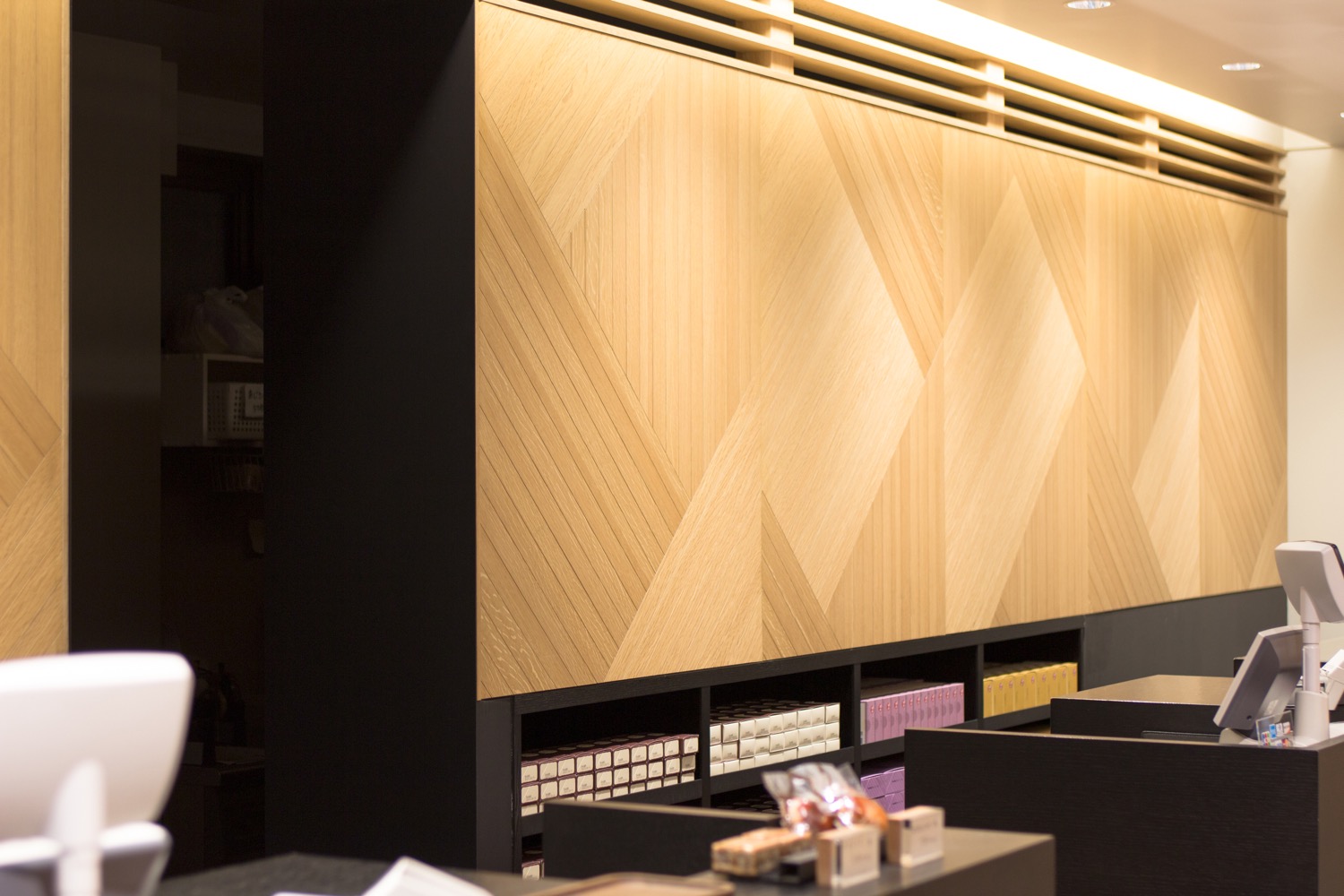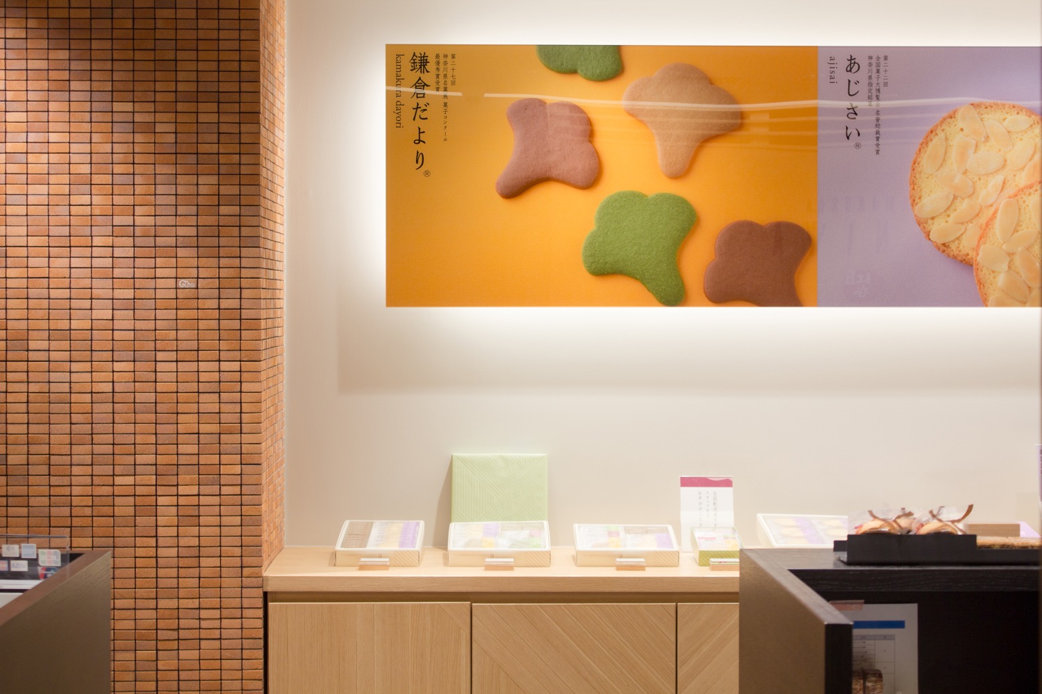 まず、手作りの焼き菓子を主軸とするメーカーの印象を作るため、お菓子の色形を忠実に再現したタイルを壁の意匠に取り込み、焼き菓子メーカーであるという印象を高めた。お菓子と空間の視覚的な関連を作るものとして、ブランドリニューアル時に設定されたパッケージの柄「鎌倉残照」の文様を、壁面の木板張りで表現。そして、企業の人の和を大切にする姿勢を体現するため、対面式ディスプレイカウンターを導入し、交わす会話で和を深められるように設計。
