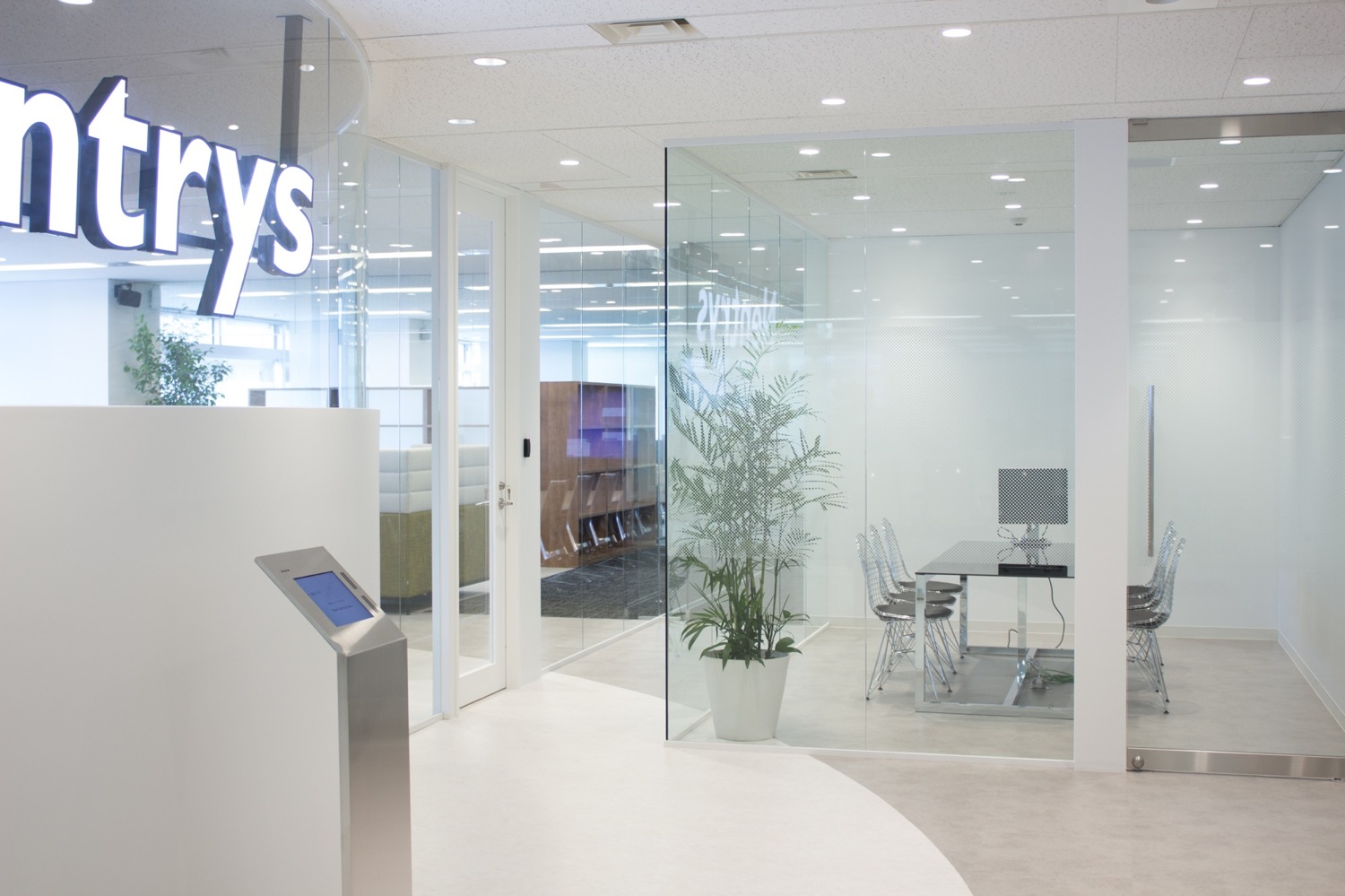 ネントリーズ株式会社は、商用車の買取・販売を行う「トラック王国」の運営を行っている企業。市場範囲は日本全国で、北関東、中部、関西にも営業拠点を持っている。今回は首都圏の2拠点統合移転プロジェクトに携わらせていただいた。入居されるオフィスは4階部分。建物周囲は住宅のため障害物が無く眺望のいい環境にあり、エントランス空間にはその眺望を引き込んだ。