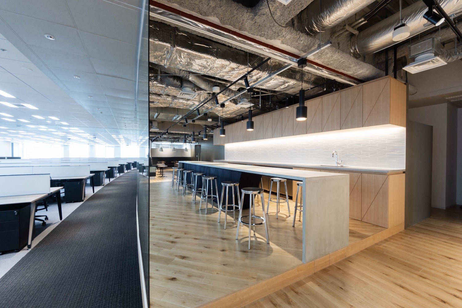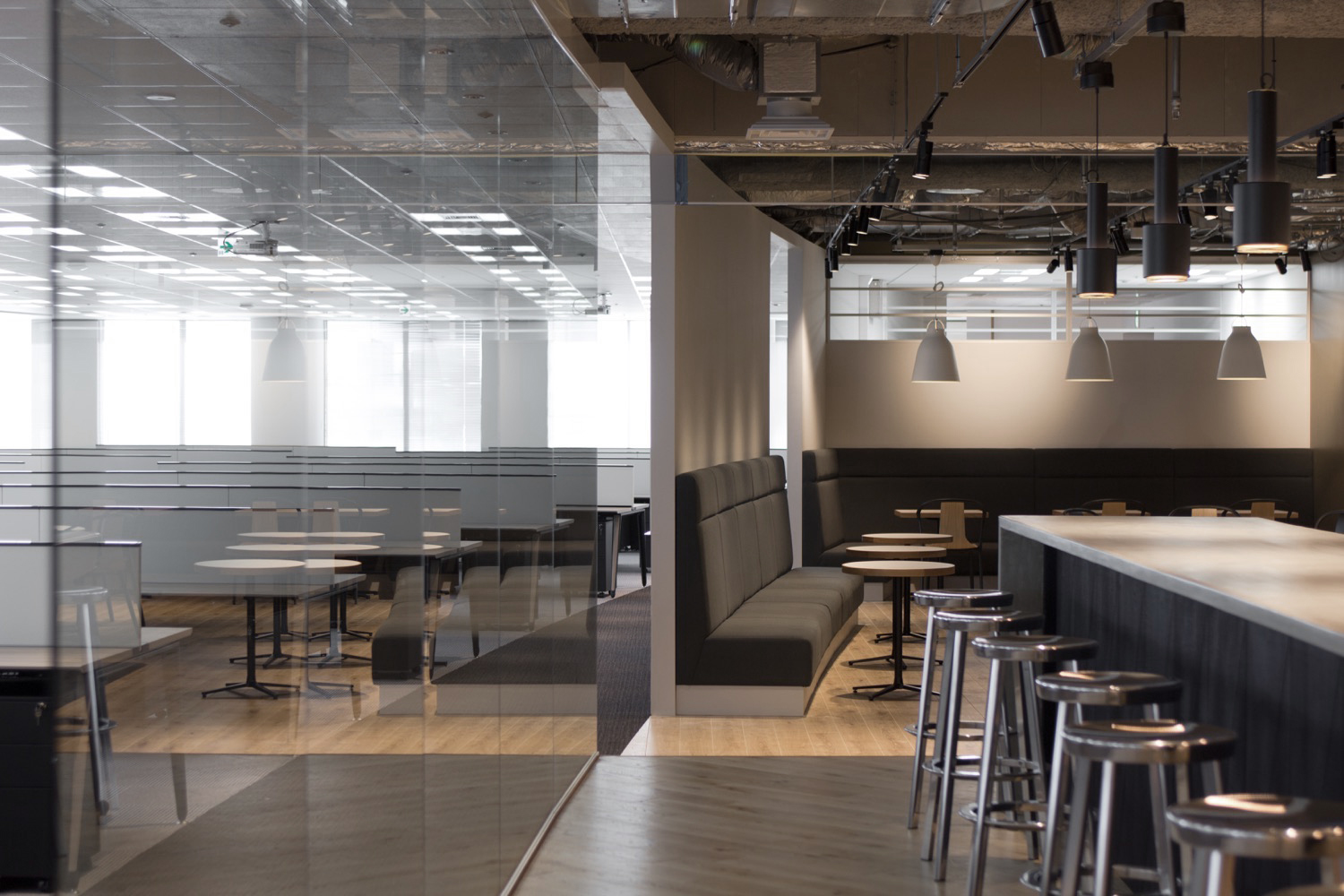 コラボレーションエリアは、ワーカー動線と絡めるゾーニングで、生活するということを軸に、企業内の文化を形成しやすいようにゾーンを設計。バーやカフェエリア、ビリヤードなどのツールを有効的に活用して社内交流が盛んになっていくことは、ストレスなく自然体で自分らしくいられる状況を作り出します。立前なく自然体で居られる状態で向き合うことは、人との距離を近づけ、信頼を感じさせる機会を増やします。企業文化は、個々の個性の集合と共通目的で形成されるため、その方向性を整え、そして支える立場で空間を設計することが、我々の考えるオフィスの役割だと考えている。