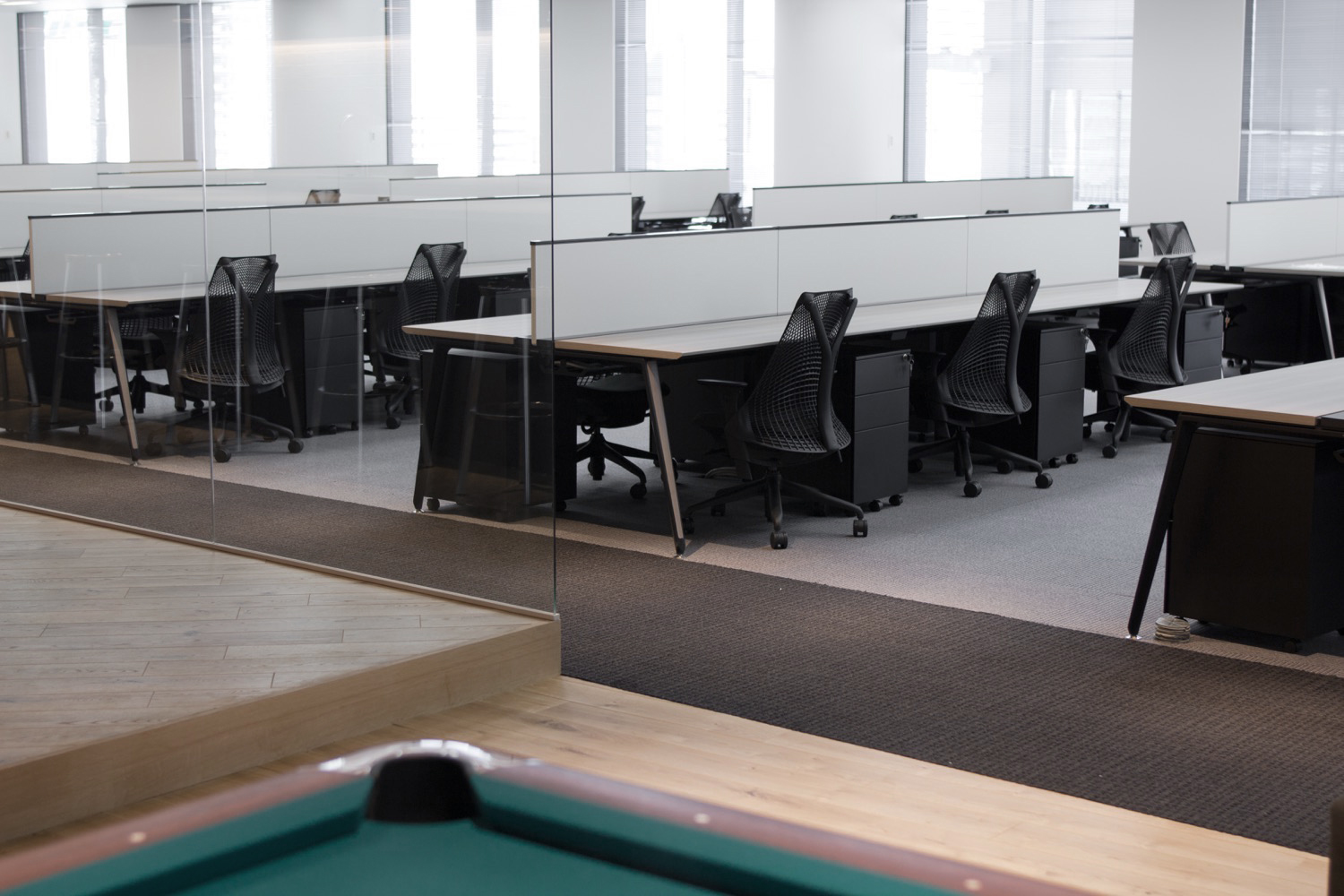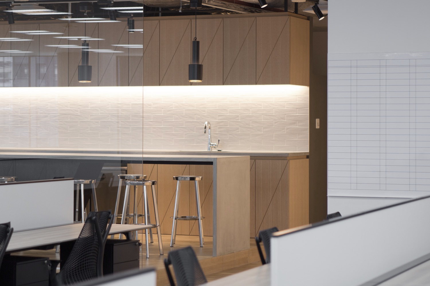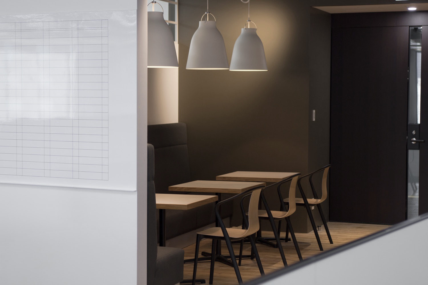 ワークエリアでは、人員増強のための画一的なレイアウトではなく、ゆるやかなテンションを持ったラインに沿うようにレイアウトすることで、空間には余白を生み、ブレイクアウトエリアやオープンミーティングの環境を作り出している。結果、動線を主軸に自然な流れで出会いの頻度が上がり、コミュニケーションを促進させる機能として働く要因になった。