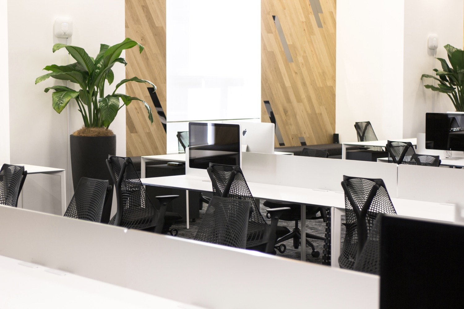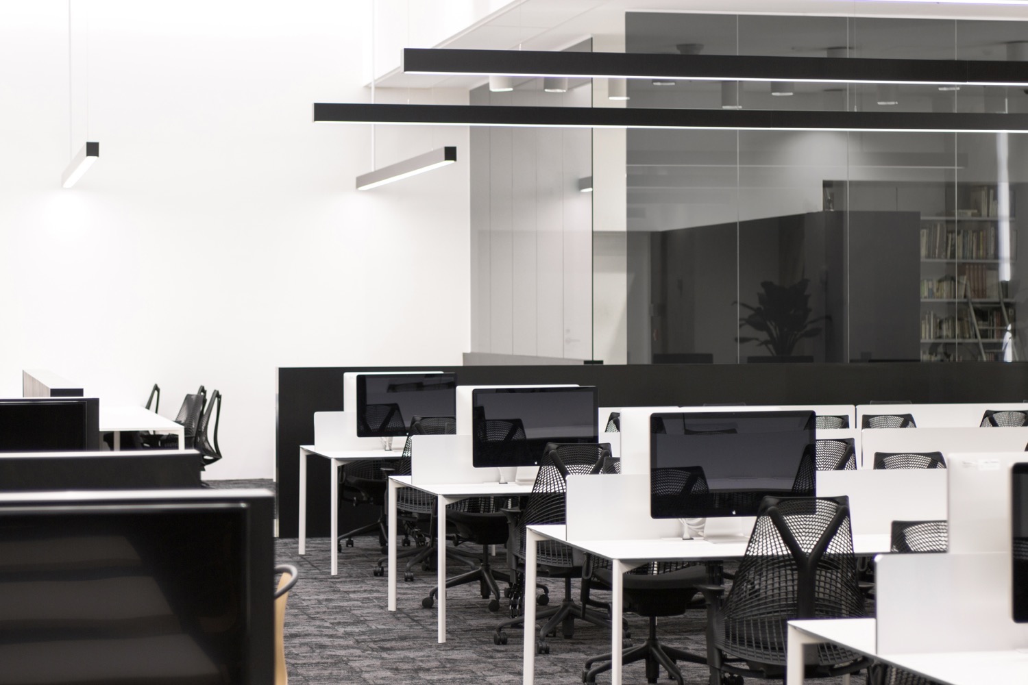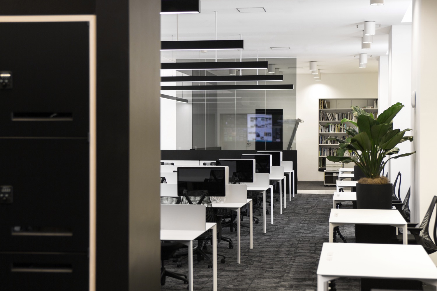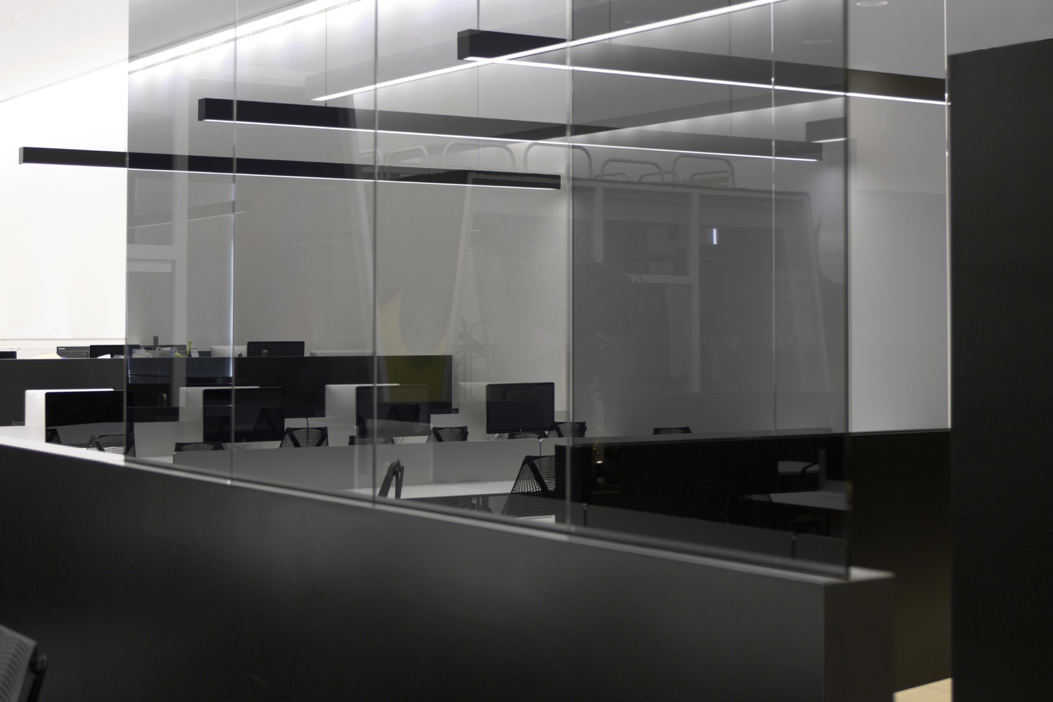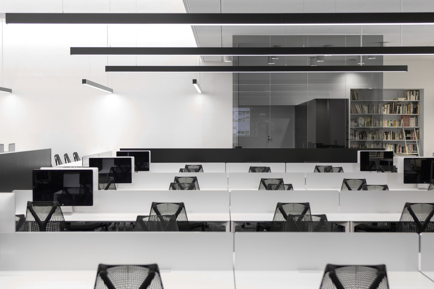 Working with a color scheme in line with the client’s brand colors and a latent arrangement of elements in their logo, the office layout presents a flat lineup of sharp, light, aluminum desks, arranged so as to stimulate collaboration between planners and designers.