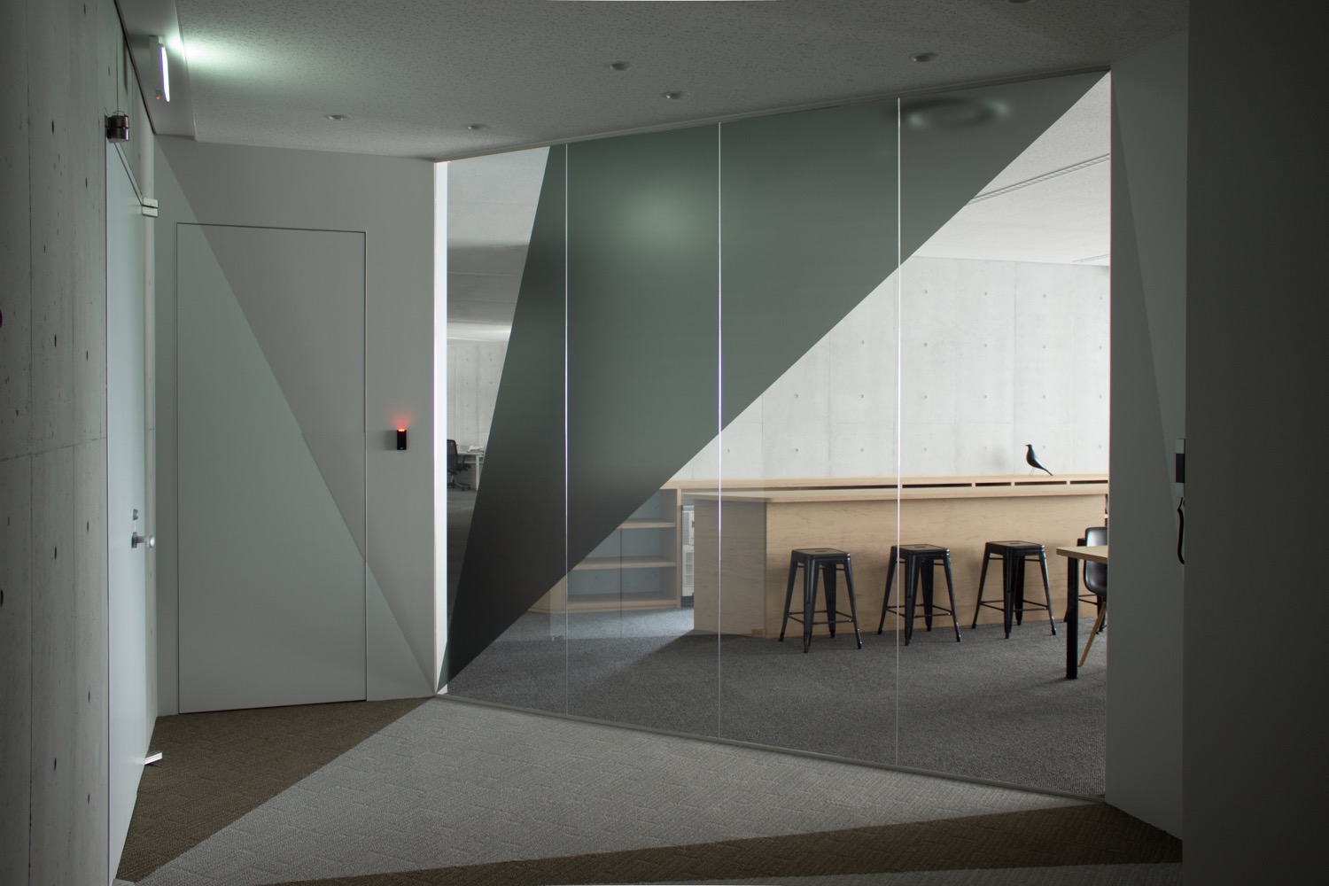ガラスで間仕切るエントランスは外光を取り入れる仕様になっており、エントランスから見えるロゴのチェックマークを通して人の表情や動きを感じさせる。企業メッセージである「データの”わかる化”で意思決定を簡単に」を、エントランスから社風を見せてどういう人達なのかが”わかる”という事で体現し、企業の社風を来訪者に言わずとも伝えられるようなデザインとなっている。