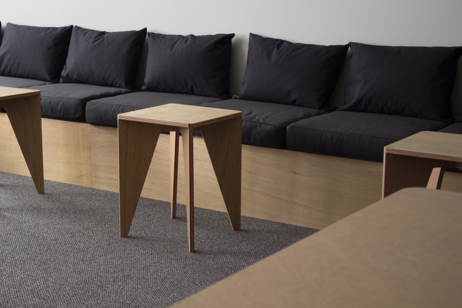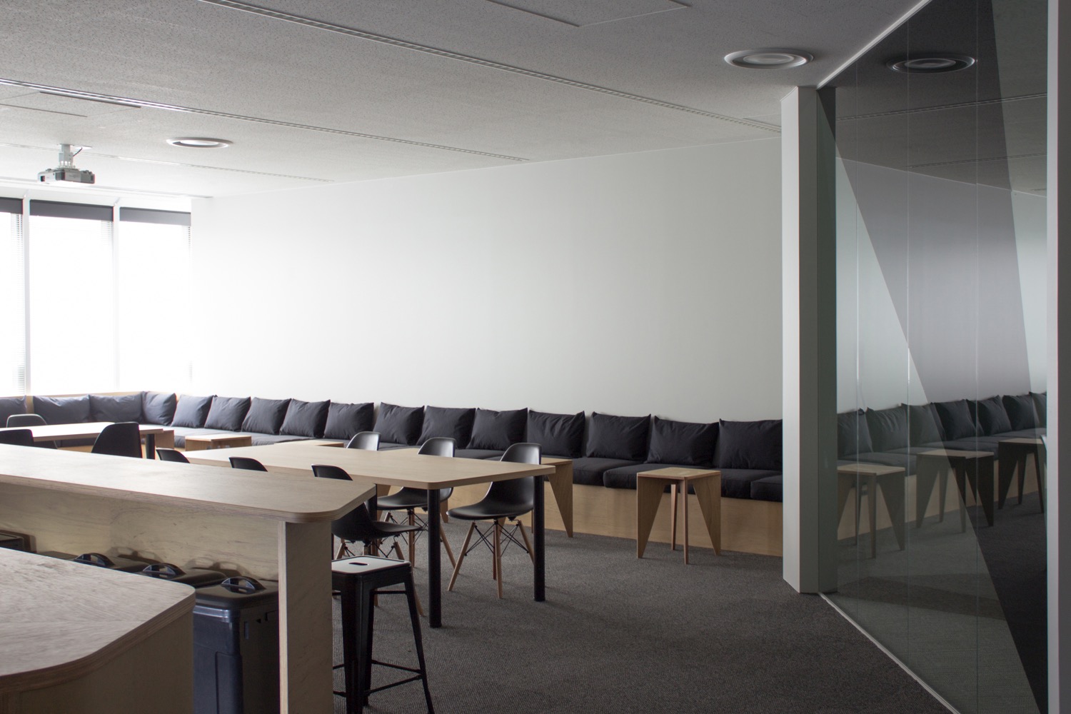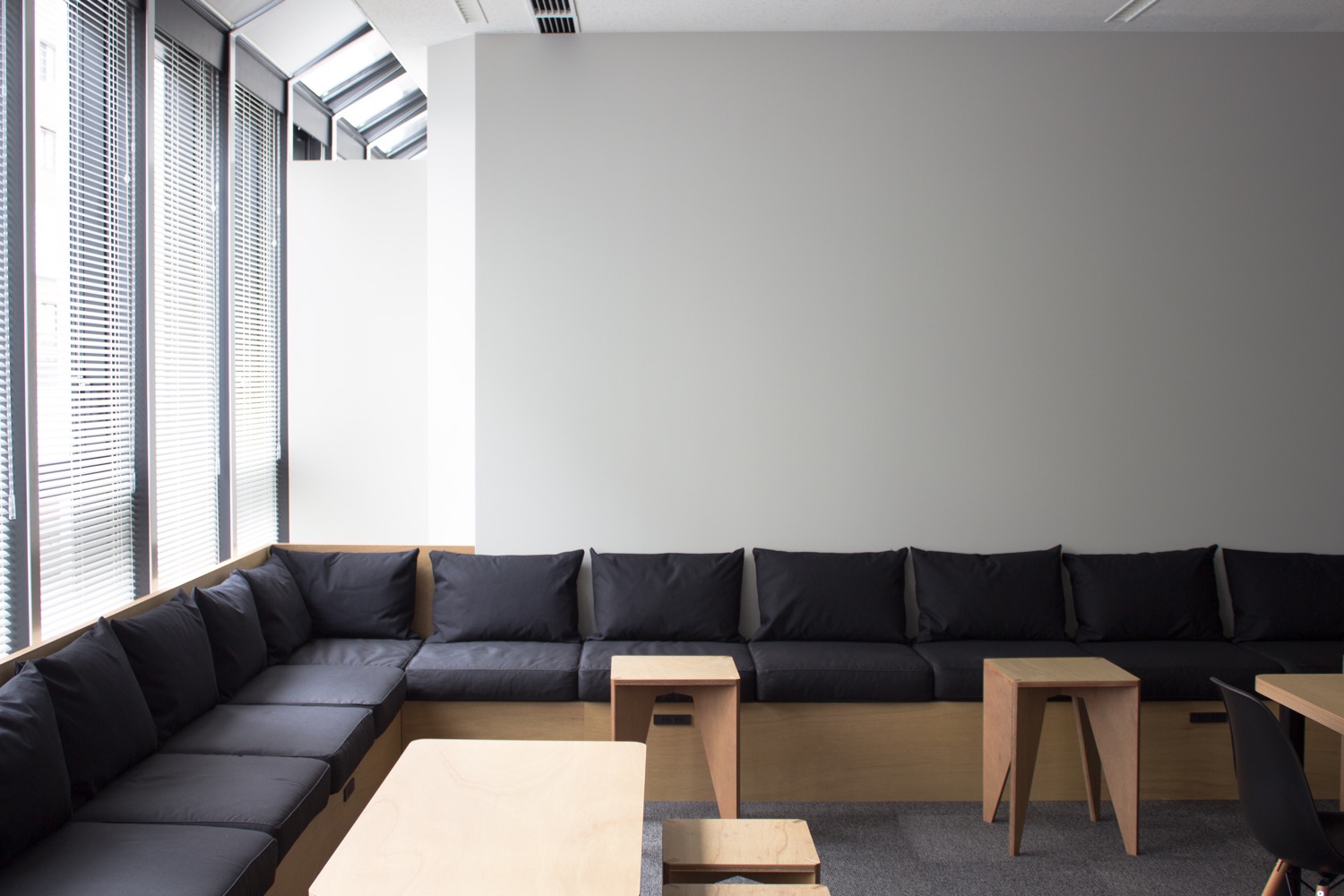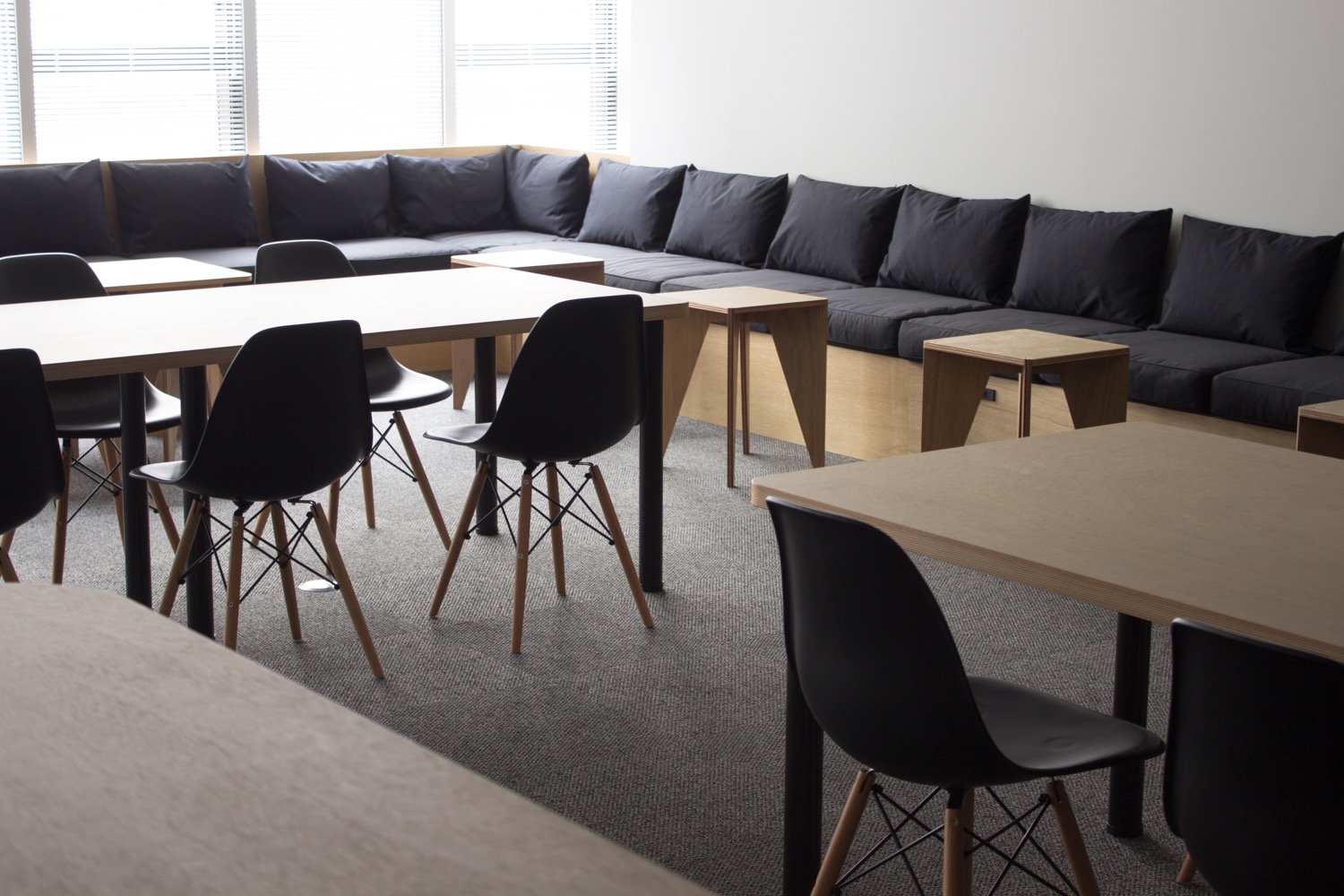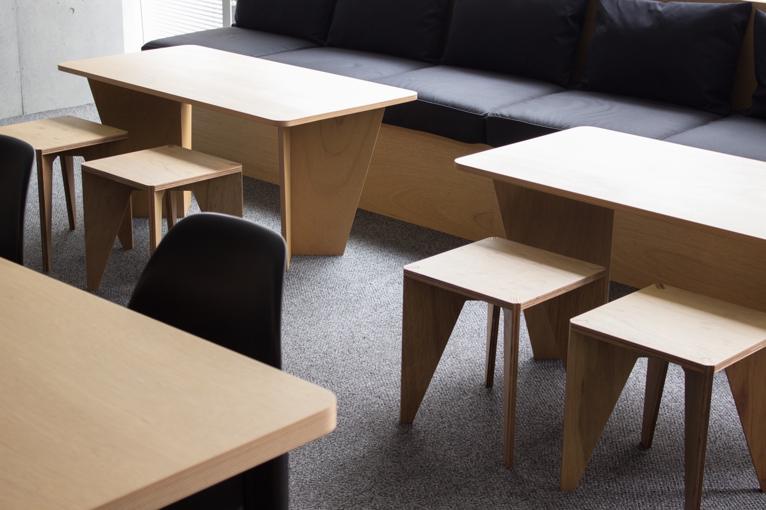エントランスから見えるコラボレーションエリアは、人の動きや存在に視線が向く様に全体のトーンを落としながらも、木材の表情で構成するオリジナル家具で、人の手に触れる部分に木材が感じさせる親しみやすさを持たせた。家具は、ワーカーの多様な働き方や気分を受け止めれる様、組み合わせなどのバリエーションを持たせた設計にしている。